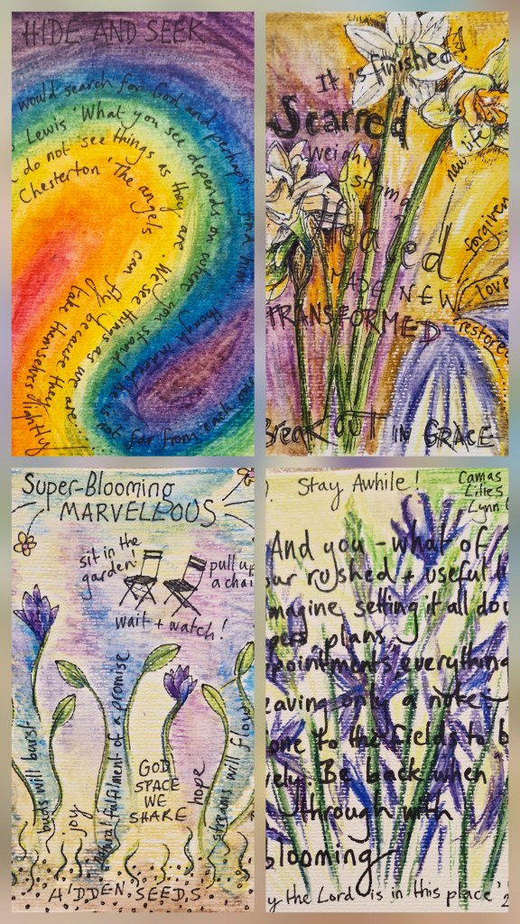 Here are my cards from the last few days. For these, the words generally came first, followed by the images and colors which I doodle and create often while listening to the linked music tracks. This week’s offerings feature daffodils, camassias, and a type of yin-yang rainbow that emerged around the text — symbols of hope, balance & grace!