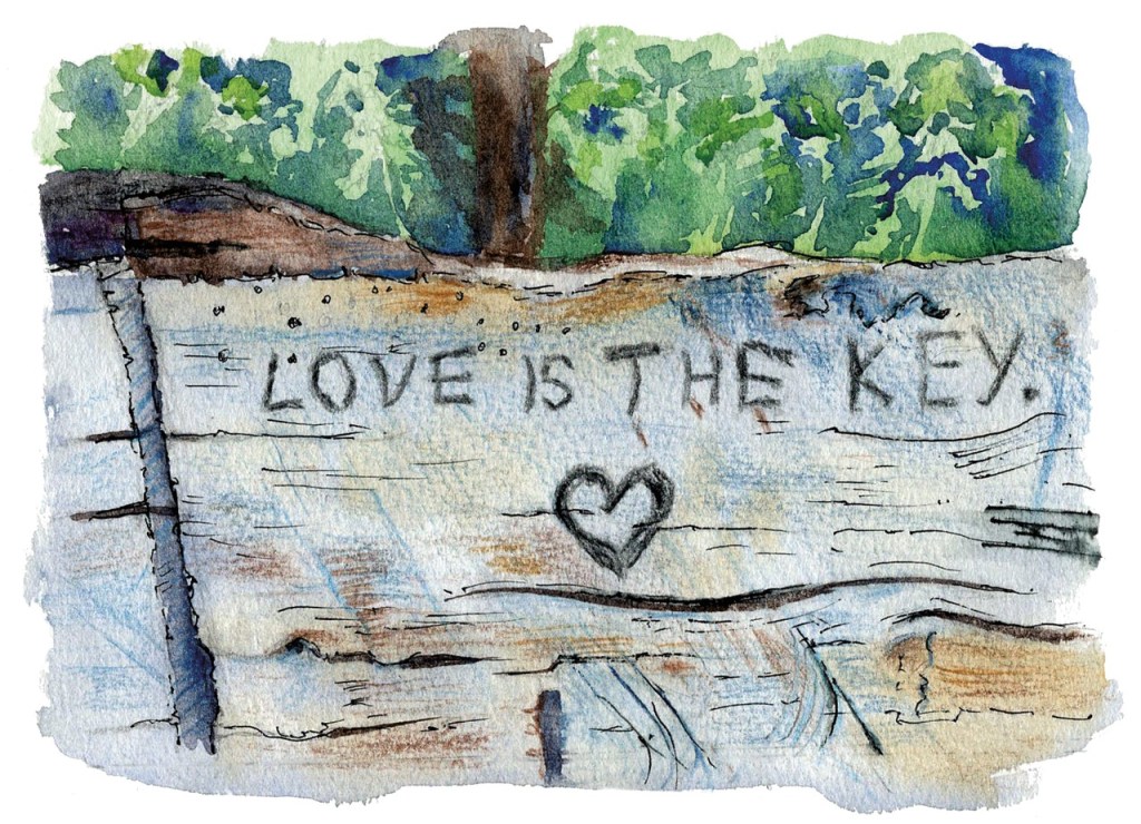 Thank you so much for your ‘Traces of Attention’. I have experienced these magical moments too. When I was walking mindfully in the countryside near my home, I came across a bench that I had passed many times before and, for the first time noticed the words, ‘Love is the key’ carved into the seat back. I drew this sketch.